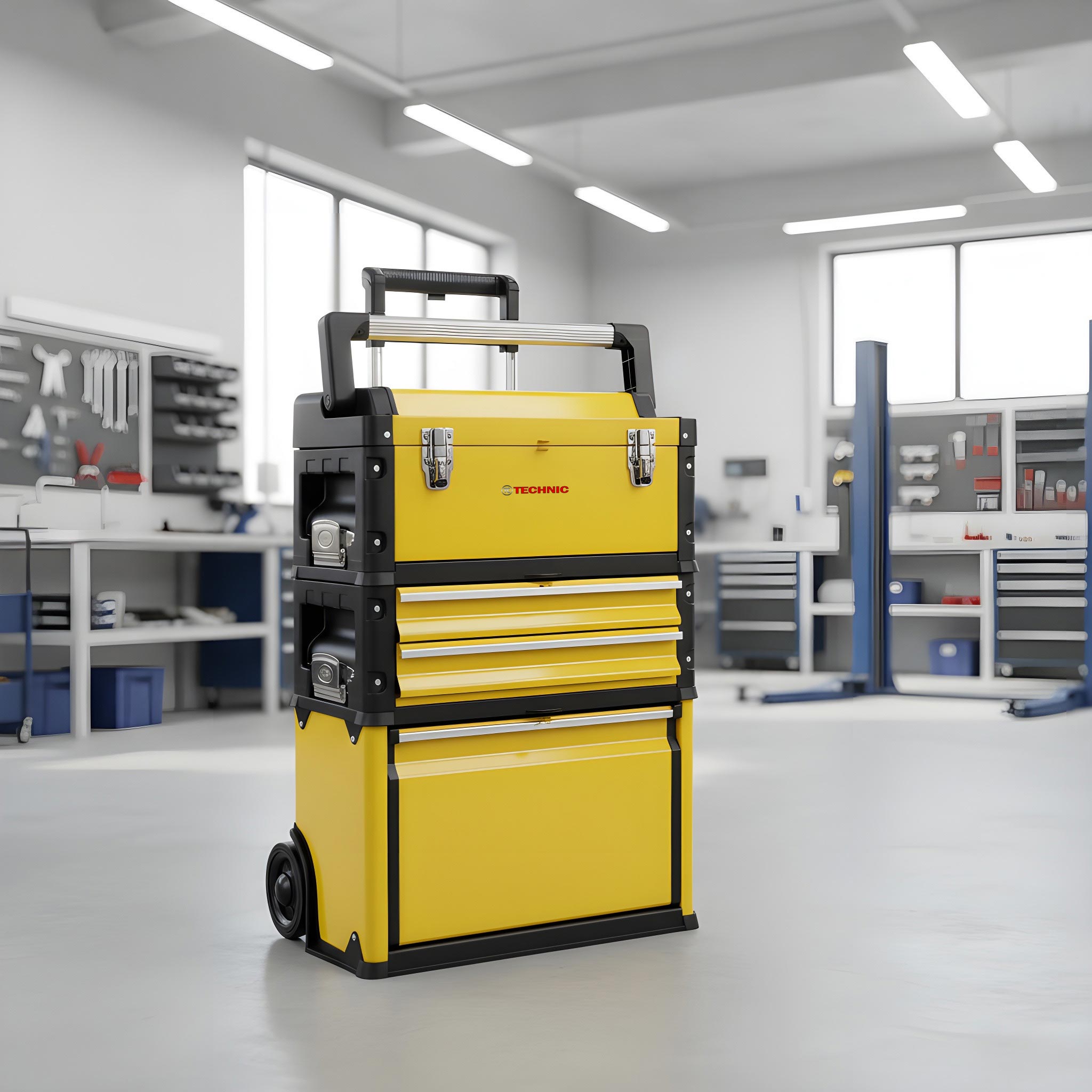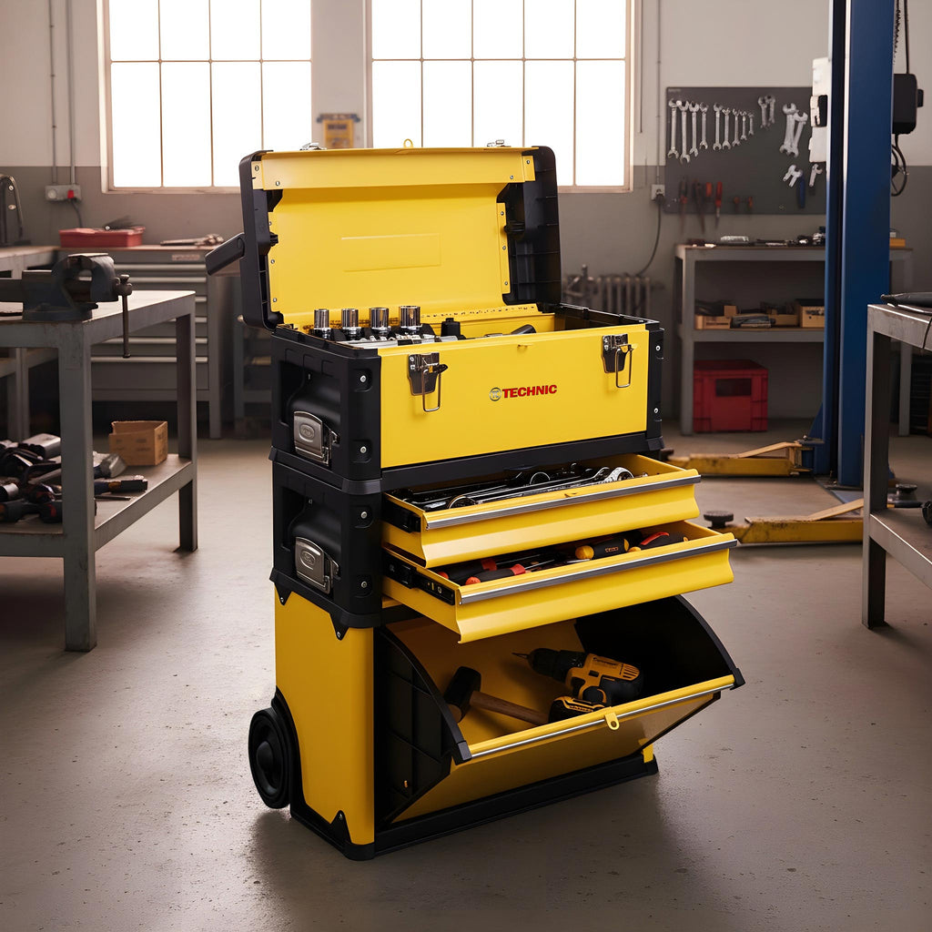 1) Horní nástrojováskříňka, kterou lze demontovat. Má pevné kovové uzávěry a možnost zajištění víka visacím zámkem. Vybavena držadlem pro přenášení. Součástí sady je podnos na drobné předměty.
